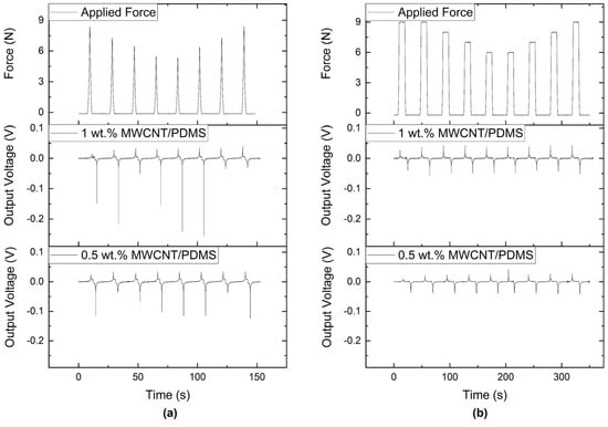 The triboelectric effect is a combination of contact electrification and electrostatic induction; the static polarised charges, resulting from the contact between the two friction surfaces with different charge affinities, are generated on the friction surfaces, causing different surface potentials, inducing charges among the two attached electrodes [,,]. In this specific case, the PDMS nanocomposites present a high triboelectric charge density. When the mechanical testing equipment touches the surface of the PDMS, the flow of electrons generates a measurable electrical voltage. The same happens at release, but the output voltage measured has an opposite sign since the electrons are leaving the surface of the PDMS []. When the materials are in contact, the output voltage is zero since there is no significant exchange of electrons between the materials. Therefore, triboelectric sensors help detect instantaneous contact and release. Even for applied forces lower than 6 N, a generated output voltage may be detected, indicating that these sensors have a fast response and are relatively sensitive. Figure 14 shows that all the nanocomposites generate output voltage under contact and release. The signal is low for the random distribution nanocomposite with 0.5 wt.% due to the low electrical conductivity across the sample. The magnetic-patterned nanocomposites and the randomly-distributed nanocomposite with 1 wt.% MWCNT, which have lower electrical resistance, generate a considerable output voltage that may be used to detect instantaneous impact and release.