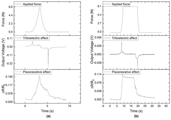 Figure 16 shows in detail the difference between the response of the sensors for fast (Figure 16a) and slow movements (Figure 16b). When analysing the presented results, it is possible to confirm that the triboelectric sensors work well to detect the contact and release of objects on the sensor’s surface, independently of the time frame and applied force. The piezoresistive effect works better for monitoring the deformation of the sensor, being capable of monitoring both fast and slow deformations.