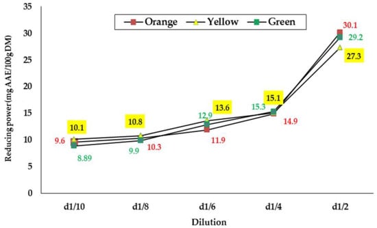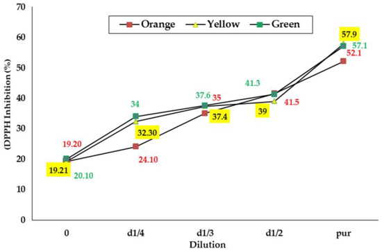 According to the results obtained, the reducing power increases with the increase in concentration of seed extracts from all three varieties (Figure 1). This observation has been confirmed by several authors [21,41,42]. The plotted curves evolve in the same way and the values obtained oscillate between 8.89 and 30.1 mg AAE/100 g for all samples. Over all the concentrations tested, significant differences were noted only at dilutions D1/8 and D1/2, and the extracts of the seeds of the green and orange varieties are those with the best reducing potential. From the different measurements, the EC50 values were deduced for each sample and are presented in Table 5. As indicated, the EC50 was almost the same for all the seed extracts (0.05 g/mL), and no significant differences were detected.