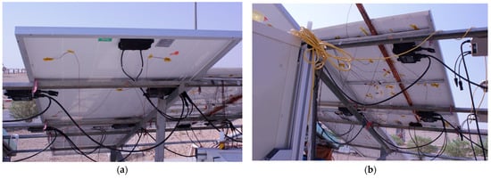 Figure 1 shows the PV/HPT cooling experimental setup. The PV/HPT system comprises a solar PV panel mounted on inclined metallic frame work with the heat pipe tubes slightly flattened and attached to the bottom of the panel (Figure 1a,b). Acetone is the used as a PCL, due to its desirable phase change temperature of 56 °C [27]. Heat is rejected to the surrounding in the extended portion of the heat pipe where condensation of the working fluid (WF) takes place. The panel attached with HPT was filled with the acetone after completely evacuating the air from it.