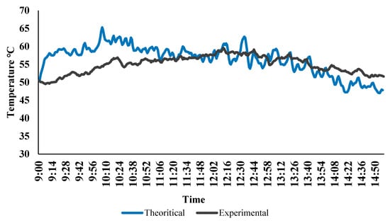 Figure 3 presents a comparison between the experimental results and the theoretical modelling of the temperature of the cooled PV panel with 100 mL acetone. It shows the real-time temperature of the PV panel for hot summer conditions over the period from 9 a.m. to 5 p.m. The difference between the experimental and theoretical results was big in the beginning of the experimentation process, and then it became smaller after the midday hours. The initial variation is attributed to high wind speed at the beginning of the data collection. The average error between the two results curves was 2.61%, which indicates a fear agreement between the theoretical and experimental results. Therefore, the modelling can be used for studying the temperature of the PV panels with HPT cooling.