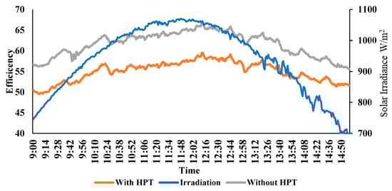 Figure 5 shows the results of the copper HPT filled with 50 mL of acetone between hour 9 and hour 15. The temperature of the PV panels with HPT was successfully kept lower than that of the reference panel over the whole experimental period. The maximum and average differences between the two curves were 7.89 °C and 6.6 °C, respectively. The average temperature of the cooled panel was 55 °C.