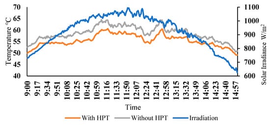 Figure 7 shows the results of the case of HPT filled with 100 mL acetone. Similar to the 75 mL case, the temperature of the cooled PV was lower than that of the reference, but the difference in the two temperatures was not better than the 50 mL case. The maximum and average differences between the two curves were 6.8 °C and 5.4 °C, respectively. The average temperature of the cooled panel was 57.7 °C. Therefore, it can be concluded that the best cooling performance was achieved when the HTP was filled by 50 mL of acetone.