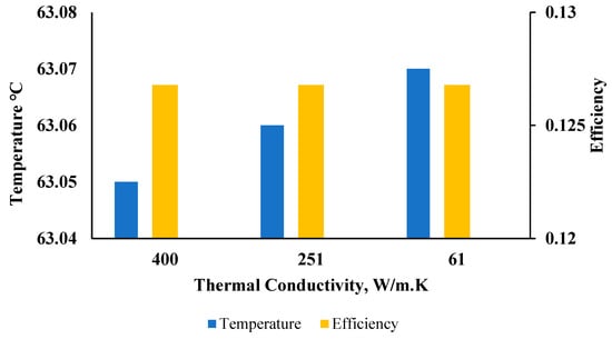 Heat pipes are made using steel, aluminum, or copper. However, the thermal conductivity of the heat pipe material has an effect on the heat conduction into the pipe from the surface of the Tedlar to the phase change liquid in the evaporation region and the phase change liquid to the atmosphere in the condensation region, as evident from Equations (13)–(15). Higher thermal conductivity achieves lower temperature and, hence, enhanced efficiency, as shown in Figure 9. A similar trend is shown when the phase change temperature is increased or decreased, as shown in Figure 10. It is clear from the figures that the thermal conductivity of the heat pipe material and the evaporation temperature of the PCL do not have a significant impact on the panel temperature or the panel efficiency.