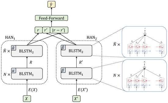 The Siamese Hierarchical Attention Neural Network (SHA-NN) [18] is an instance of the general attentional framework when the encoders are Hierarchical Attention Networks [19] based on Bidirectional Long Short Term Memory (BLSTM) [33,39] with attention mechanisms, i.e., , , and . The BLSTM layers are shared for documents and summaries, both at sentence level ( with dimensionality ) and at document level ( with dimensionality ). However, the attention mechanisms for both branches of the Siamese model are not shared. Regarding classifier c, it is a feed-forward network. The architecture can be seen in Figure 2.