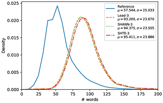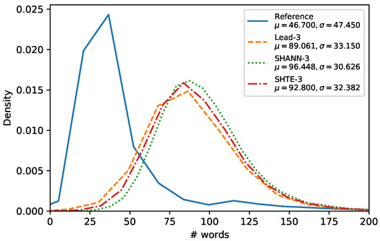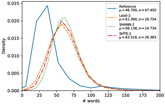 Following the experimentation carried out by Mendes et al. in [30], we analyzed the lengths of the summaries generated by our proposals. Figure 4, Figure 5 and Figure 6 show the word-length distributions of the summaries for Lead, SHA-NN, and SHTE systems (with ) applied on CNN/DailyMail corpus and NR-Ext subset of NewsRoom. We included also the word distribution of the human reference summaries for both corpora.