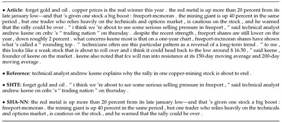 In Figure 7 and Figure 8, we show two examples of summaries generated by the SHTE and SHA-NN systems both for NewsRoom and CNN/DailyMail respectively. In the NewsRoom example, the SHTE model generates a shorter summary than SHA-NN, extracting the first sentence of the document as a short and direct lead. Additionally, it is the only model that makes explicit the name of the analyst (technical analyst andrew keene, in the 5th sentence), like in the reference summary. Differently, SHA-NN prefers the sentence that contains the introduction to the analyst’s statements (4th sentence), but does not contain its name. Only SHA-NN mentions the copper (red metal), the mining (mining giant), and the end of the stock (rally could be over). It should be noted that, in this example, SHA-NN prefers the longest sentences that appear before in the document (3rd and 4th), differently from SHTE (1st and 5th). For the CNN/DailyMail example, both systems extract the first article sentence. Along with it, SHTE extracts a sentence related to the reference summary and one irrelevant sentence. In the same way, this behavior is also observed in SHA-NN where the related sentence extracted is different from the one extracted by SHTE. If the 3rd sentence extracted by SHTE and the 2nd extracted by SHA-NN were selected, almost all the semantic of the reference summary would be covered. It is also interesting to note that the generated summaries are much longer than the reference summaries, due to our systems being restricted to selecting full article sentences; however, the reference summaries could be composed of simplified sentences.