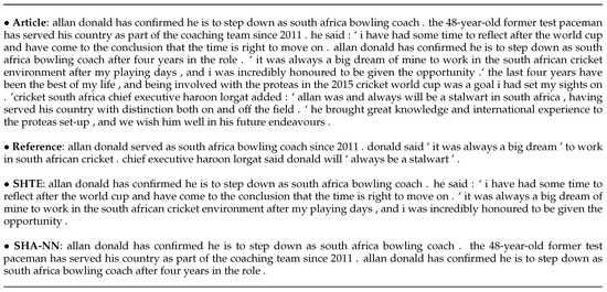 - Grusky, M.; Naaman, M.; Artzi, Y. Newsroom: A dataset of 1.3 million summaries with diverse extractive strategies. In Proceedings of the 2018 Conference of the North American Chapter of the Association for Computational Linguistics: Human Language Technologies, New Orleans, LA, USA, 1–6 June 2018; Association for Computational Linguistics: New Orleans, LA, USA, 2018. Long Papers. Volume 1, pp. 708–719. [Google Scholar]
