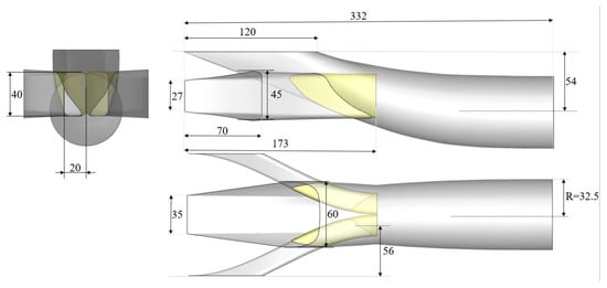 The inlet efficiency of the submerged inlet is high when there is a windward surface, so an inlet layout that will produce an additional windward surface in the flight state of a large sideslip maneuver is designed. Its three views and main parameters are shown in Figure 2. A submerged inlet, called auxiliary inlet, is arranged on both sides of the submerged inlet. The submerged auxiliary inlet is connected with the main inlet, and its main function is to create an additional windward surface for the inlet during sideslip maneuver, so as to improve the low intake efficiency of the conventional submerged inlet during a large sideslip maneuver. The auxiliary inlet is designed according to the design method of submerged inlet, and then the designed auxiliary inlet and main inlet are trimmed and the intersection line is smoothed. In Figure 2, gray is the part that needs to be retained after the trim of the distributed inlet, and yellow is the part that needs to be deleted after the trim.