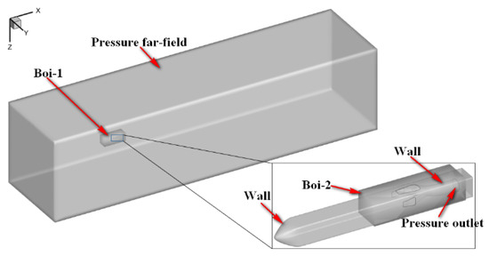 Figure 4 shows the surface mesh of the missile, inlet, and far field. The mesh form adopts unstructured polyhedral mesh. The far-field calculation domain of the conventional submerged inlet configuration and the distributed submerged inlet configuration are identical. Both are cuboids with length, width, and height of 40 m, 10 m, and 10 m respectively. The two configurations of the inlet and the body model body surface mesh size are the same. The minimum size of the body surface mesh is 1 mm and the maximum size is 5 mm; the minimum size of the inlet surface mesh is 1 mm, the maximum size is 3 mm.