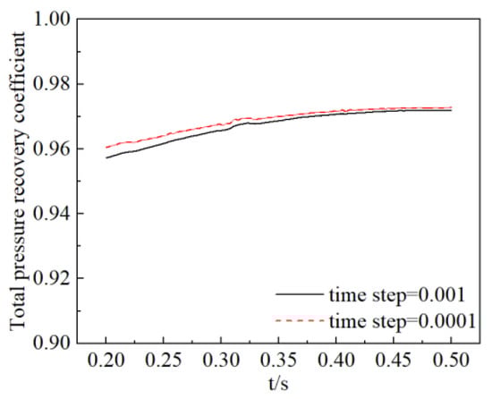 The average total pressure recovery coefficient in 0.2~0.5 s is shown in Table 2. When the step length is 0.001 s, the average total pressure recovery coefficient during 0.2 to 0.5 s is 0.966. When the step length is 0.0001 s, the average total pressure recovery coefficient is 0.968 during 0.2 to 0.5 s. Based on the calculation result with a step of 0.0001 s, the error of the calculation result with a step of 0.001 s is only 0.2%, which means that a step of 0.001 s is sufficient to accurately capture the flow field details. Considering the computational efficiency and accuracy, the step size used in the transient calculation is 0.001 s.