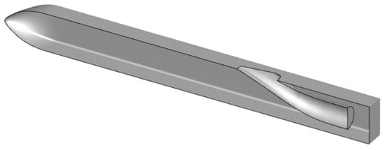The main research object of this paper is the conventional submerged inlet configuration and the distributed inlet configuration with additional auxiliary inlets on both sides of the body. For ease of reading, the former is referred to as the conventional submerged inlet configuration, and the latter is referred to as the distributed inlet configuration. The conventional submerged inlet configuration, the distributed inlet configuration, and the projectile body are shown in Figure 3. The cross-section shape of the projectile body is a filleted rectangular shape. The inlet opening is located on the lower belly plane of the missile body, and the upper and lower surfaces of the missile body are inverted for easy observation (the upper and lower surfaces are inverted in the subsequent relevant pictures).
