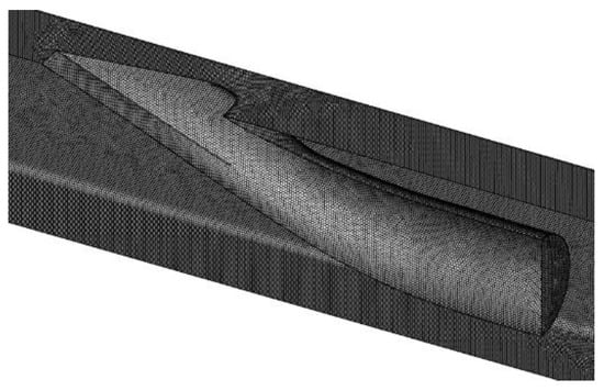 In order to verify the accuracy of the numerical simulation method in this paper, the flow field of the missile body and the submerged inlet in the literature [40] was simulated and compared with the relevant experimental data. The calculation model is shown in Figure 8.