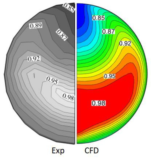 The experimental results show that of the missile body and the submerged inlet is 0.9220 when = 0.73 and = 0.4. In the calculation results, at the outlet of the inlet is 0.9244, and the error between the numerical simulation results and the experimental results is only 0.26%. Figure 10 shows the total pressure distribution at the outlet of the inlet, which is also in good agreement with the experimental results. Therefore, the accuracy of the numerical simulation method in this paper is verified.