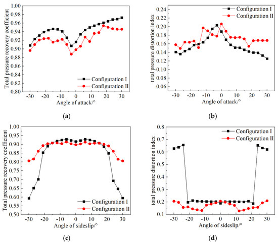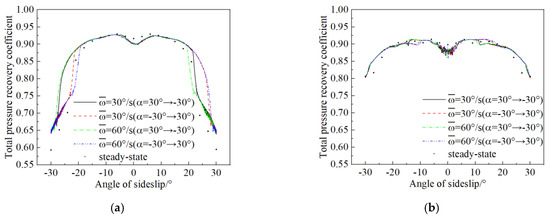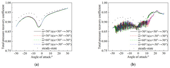 It can be seen from Figure 14a that there is a certain hysteresis phenomenon in the pitching maneuver cycle. In the pitching up process (in the process of from −30° to 30°), the total pressure recovery coefficient is slightly lower than that in the pitching down process (in the process of from 30° to −30°), and the hysteresis phenomenon is obvious in the range of −10° to 0°.