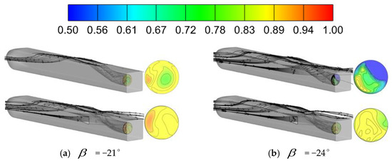 In order to better reveal the formation and development mechanism of flow in the submerged inlet under large sideslip condition, and Figure 12 lists the main flow characteristics in the inlet under typical sideslip angles. It can be seen from Figure 12a that when = −21°, the side edges on both sides of the inlet of the conventional submerged inlet can generate entrainment vortices. However, due to the different angles of the airflow passing through the side edges on both sides, the intensity of the entrainment vortices generated by the side edges with the same direction as the incoming flow is weak, and part of the airflow is not drawn into the inlet. With the further increase of , the intensity of the entrainment vortices generated by the side edges with the same direction of the incoming flow gradually weakens. It can be seen from the Figure 12b–d that when the absolute value of is greater than 24°, the entrainment vortices beneficial to the intake cannot be generated, and at the same time, there is obvious air separation. An obvious low total pressure area can be observed at the outlet of inlet. The area of the low total pressure area accounts for about one third of the total area. The same problem is also encountered at the side edges of the main inlet of the distributed inlet configuration. However, since the auxiliary inlets on both sides have a certain windward surface during sideslip maneuver flight, which can provide high energy airflow for the intake system to make up for the deficiencies of the inlet during large sideslip flight, no obvious low-pressure area is observed at the outlet of the inlet, and is above 0.8.