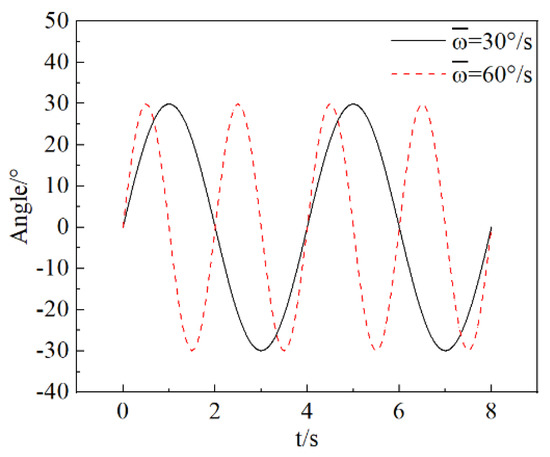 The background mesh remains stationary, and the given internal rotation domain mesh rotates along with the aircraft around the center of gravity in a single-axis, and the law is a sine function. In order to study the effect of pitch rate on the dynamic characteristics of the inlet, two motion laws shown in Figure 13 are applied to the mesh in the rotating domain. Due to the characteristics of the chord function, the angular velocity at different angles in the process of motion is different. The velocity is low near the peak or trough, and high away from the peak or trough. Therefore, the angular velocity marked in the figure is the average angular velocity.