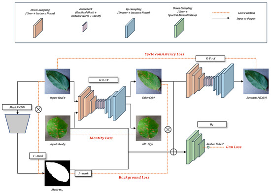 27] proposed a LeafGAN model that solved CycleGAN’s problem of changing unwanted content such as background when transforming plant leaf images. Their contribution is to propose an LFLSeg module that can segment leaf regions relatively simply and use it to control the transformation of background regions. The author proposed a background loss function to control the transformation of the background area by the generator and used only the input from which the background was removed as the input of the discriminator so that the discriminator for the background area did not react. The experiment was conducted based on actual data collected in the natural environment, and it was reported that classification performance was partially improved when learning was performed with a dataset augmented by the proposed model.