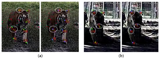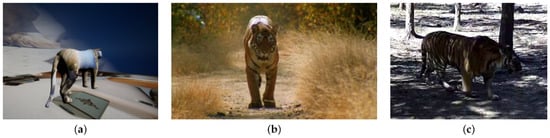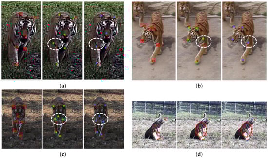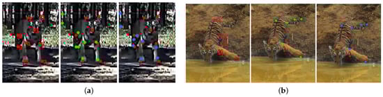 TigDog. The TigDog dataset [] provided key-point annotations for horses and tigers, where the images were taken from YouTube (for horses) and National Geographic documentaries (for tigers). Each image was annotated with 19 key points. These key points were distributed as follows: two key points on the eyes, one key point on the chin, two key points on the shoulders, twelve key points on the legs, one key point on the hip, and one key point on the neck. Among them, 11 key points overlapped with those defined by the ATRW []. These overlapping key points were used for evaluation in this paper. For convenience, we call the subset of tiger images in this dataset TD-Tiger (see Figure 6b).