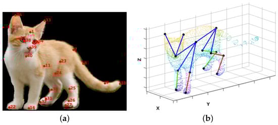 In addition, there are also several works focusing on shape reconstruction. Kanazawa et al. [] learned the deformation and stiffness of 3D animal meshes from manually annotated 2D images. Zuffi et al. [] introduced the skinned multi-animal linear model (SMAL), which is similar to the popular skinned multi-person linear model (SMPL) [] for humans. Zuffi et al. [] fit the SMAL model to several images of the same animal and then refined the shape to better fit the image data, so as to obtain shape and texture (SMAL with Refinement, SMALR). These algorithms [,,] also require ground-truth pose to train the models.