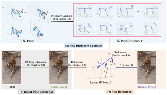 Despite the improvements made by these approaches [,,,,,], animal pose estimation is still non-trivial. These methods are trained on images with 2D pose annotations, which may not follow the real distribution of animal poses and very likely degrade their performance, especially for poor-quality images. In contrast to these methods, this paper aims to explore the 3D knowledge of animals for refining estimated animal poses such that the misaligned key points caused by image noise can be amended toward their true positions. Inspired by [,,,,], we used a 3D pose dictionary to encode 3D prior constraints, which is simple and effective. Note that previous studies [,,,,] require large-scale real 3D human poses as the training data for the dictionary, but collecting real 3D animal pose data is very difficult if not impractical. To address the lack of 3D animal pose data, we collected and synthesized data for 3D pose dictionary learning.