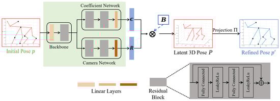 We provide a deep-learning-based implementation, in which both the coefficients and the rotation matrix in Equation (6) are estimated using a neural network. Figure 5 shows the pipelines. The proposed network consists of the coefficient network and camera network. Given the initial pose p as network input, the coefficient network and camera network estimate coefficients and rotation matrix in Equation (6), respectively. The coefficients and the rotation matrix estimated via the network are combined with the learned 3D pose dictionary B to generate the 3D pose P corresponding to the initial pose p. Finally, the 3D pose P is reprojected to obtain the refined pose .