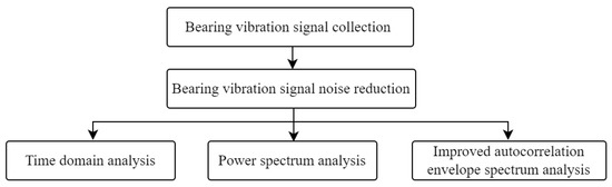 The failure caused by the incipient weak local damage of the bearing will produce vibration and shock. However, due to the short duration of shock, energy divergence, wide frequency range, and small vibration amplitude, small faults are often submerged in background noise and are difficult to find and extract [27,28]. This article uses fiber Bragg grating resonant sensors to monitor bearing. According to the collected data, noise reduction, time domain, power spectrum and improved autocorrelation envelope spectrum analyses are performed in sequence to realize the detection and diagnosis of bearing faults. The process of bearing fault detection and identification is shown in Figure 1.