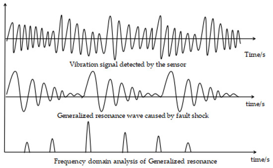 The specific process of fiber Bragg grating resonant sensor monitoring bearing is as follows: when a partial failure occurs on the surface of a certain component of the bearing, it will collide with the surface of other components during the loaded operation. This produces a concentrated shock pulse force. The sensor absorbs shock energy to generate a generalized resonance wave, and releases energy at the sensor’s own high-frequency natural frequency. After processing the high-frequency resonance wave, a vibration waveform that eliminates low-frequency vibration interference but is rich in fault information can be obtained. The vibration signal in this process is measured by the fiber Bragg grating. The fiber Bragg grating converts the vibration signal into the axial strain of the fiber Bragg grating, and then uses the high-speed fiber Bragg grating demodulator to obtain the center wavelength of the fiber Bragg grating. By monitoring the wavelength dynamics of the fiber Bragg grating change, the bearing vibration can be monitored [29,30]. The process of picking up weak faults is shown in Figure 2.