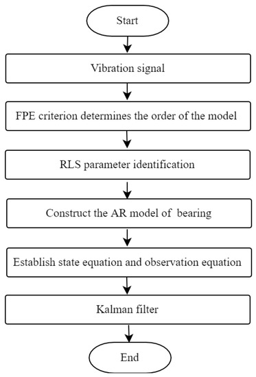 Due to the harsh working environment of the bearing, the vibration signal collected by the sensor contains a lot of noise. In order to accurately realize the detection and identification of the faulty bearing’s signal, it is necessary to reduce the noise of the vibration signal collected by the sensor. This article establishes the AR model, determines the AR model order through the FPE criterion, and then determines the AR model parameters through the RLS algorithm, and finally uses the Kalman filter to achieve noise reduction. The main process is shown in Figure 3.