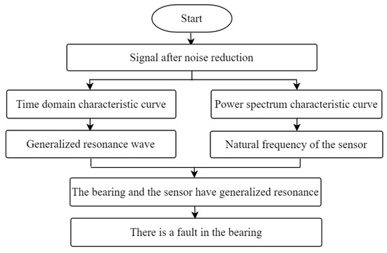 The detection process of the bearing faulty signal is as follows: first, the time-domain analysis is performed on the signal after noise reduction. If the time-domain characteristic curve has attenuated oscillation, it indicates that there is a generalized resonance wave. Then, analyze the power spectrum of the signal after noise reduction, and the extracted high frequency components is close to the natural frequency of the fiber Bragg grating resonant sensor, which further shows that the bearing and the fiber Bragg grating resonant sensor have a generalized resonance phenomenon. According to the generalized resonance principle, when there is a weak fault in the bearing, the fault will have a generalized resonance phenomenon with the fiber Bragg grating resonant sensor. Bearing fault detection can be realized by time-domain analysis and power spectrum analysis. Figure 4 shows the process.