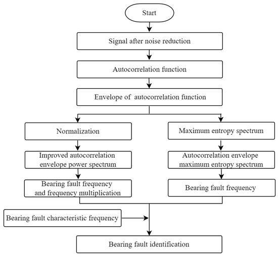The bearing fault identification process is as follows: improved autocorrelation envelope spectrum analysis is performed on the signal after noise reduction, the fault frequency is extracted, and the fault frequency is compared with the fault characteristic frequency of the bearing to determine the location of the bearing fault. The bearing fault identification process is shown in Figure 5.