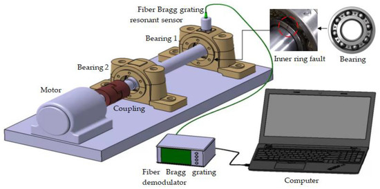 The bearing fault monitoring experiment platform is built with UG software. It mainly includes a drive motor, a coupling, a bearing 1, a bearing 2, a fiber Bragg grating resonant sensor, a fiber Bragg grating demodulator, and a computer, as shown in Figure 6.