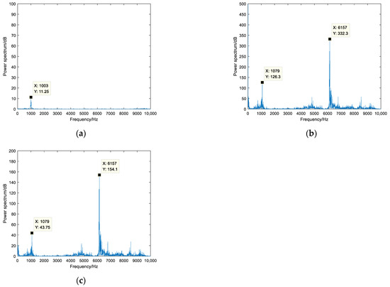 The power spectrum analysis of the normal bearing’s vibration signal, the faulty bearing’s vibration signal and the vibration signal after noise reduction by the Kalman filter are shown in Figure 14. The three power spectrums in Figure 14a–c contain low frequency components of 1003 Hz, 1079 Hz and 1079 Hz respectively. These low frequency values do not affect the diagnosis of bearing faults.