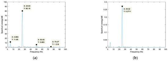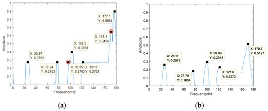 The following is the envelope spectrum analysis of the faulty bearing vibration signal, as shown in Figure 15. Combined with the theoretical value of the bearing fault characteristic frequency in Table 1, fIR = 25 Hz. In Figure 15a, the frequency components are 25.97 Hz, 77.24 Hz, 102.5 Hz, 121.8 Hz, 177.1 Hz. These frequencies are multiples of the inner ring fault characteristic frequency, respectively, are fIR, 3fIR, 4fIR, 5fIR, 7fIR. It can be diagnosed that the bearing fault occurs in the inner ring. Among them, 96.55 Hz, 171.1 Hz are the interference frequencies, which have been marked with a red circle.