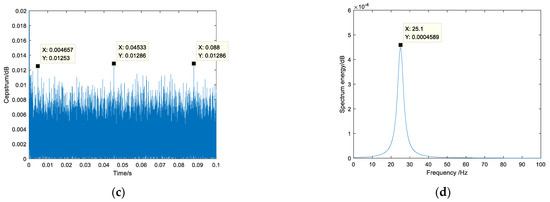 The cepstral analysis method adopted by the literature [32] is shown in Figure 16c. In Figure 16c, the x-axis is the time domain, and the peak value appears every 0.04 s. From this, it can be determined that there is a periodic frequency, which is 25 Hz.