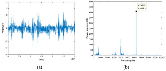 Wavelet transform is a common and effective method in extracting weak signals. The wavelet transform decomposes the signal into the scale domain, and through multi-resolution decomposition, the weak signal components in the original signal become prominent. First of all, the bearing vibration signal is decomposed and reconstructed by 11 layers using Haar wavelet. The reconstructed signal is shown in Figure 17a. The recombined signal is then subjected to power spectrum analysis, as shown in Figure 17b.