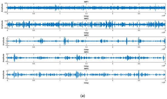 Empirical mode decomposition (EMD) is often used to extract weak faults of bearings. It can decompose complex signals into a limited number of intrinsic mode functions. The decomposed IMF components contain local characteristic signals of different time scales of the original signal. The bearing signal is decomposed by EMD. The time-domain signal and spectrum of 1–5 IMFs are shown in Figure 18.