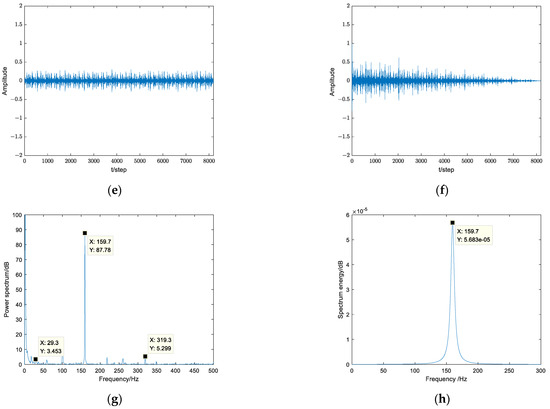 The fault signal of the bearing inner ring and its power spectrum are shown in Figure 19a,b. The AR model is established based on the vibration signal of inner ring, and the model order is 6, as shown in Figure 19c. The model parameters have convergence, respectively 0.9335, −1.5689, 1.4184, −1.2555, 0.6631, −0.4627, as shown in Figure 19d. The signal after the Kalman filter is shown in Figure 19e. The autocorrelation function has tailing, as shown in Figure 19f. The SNR after filtering is 9.1874. An improved autocorrelation envelope power spectrum, 159.7 Hz and 319.3 Hz correspond to the inner ring fault frequency and its multiple frequency, and 29.3 Hz corresponds to the shaft frequency, as shown in Figure 19g. The maximum amplitude extracted by autocorrelation envelope maximum entropy spectrum corresponds to the fault frequency of bearing inner ring, as shown in Figure 19h.