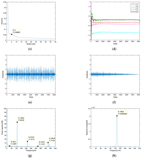 The fault signal of the bearing outer ring is obvious, and the time domain signal and its power spectrum are shown in Figure 20a,b. AR model order is 5, as shown in Figure 20c. Model parameters are −0.1491, −1.1965, 0.1153, −0.3152, 0.1179, as shown in Figure 20d. The signal after the Kalman filter is shown in Figure 20e. The autocorrelation function has tailing, as shown in Figure 20f. The SNR after filtering is 16.3518. Improved autocorrelation envelope power spectrum, 106.9 Hz, 212.4 Hz, 319.3 Hz, 424.8 Hz correspond to the outer ring fault frequency and its multiple frequency, and 29.3 Hz corresponds to the shaft frequency, as shown in Figure 20g. The maximum amplitude extracted by autocorrelation envelope maximum entropy spectrum corresponds to the fault frequency of the bearing outer ring, as shown in Figure 20h.