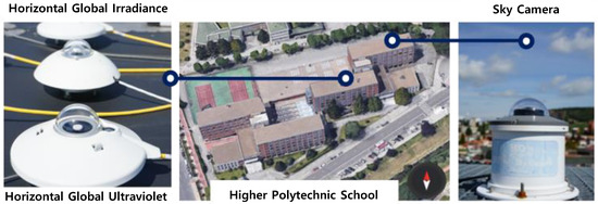 The data were collected at the weather station located on the flat roof of the Higher Polytechnic School of the University of Burgos (42°21′04″ N, 3°41′20″ W, 956 m above mean sea level), shown in Figure 1. The experimental campaign ran from March 2020 to May 2022. Data were collected every 30 s and averages were recorded every 5 min. The experimental data , , were subjected to the quality control (QC) procedure proposed in the MESoR project [36]. Regarding data, it has been established that it could not be higher than extraterrestrial UV on the horizontal plane, corresponding to the same time frame. was calculated using Equation (1):