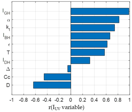 Selection of meteorological variables to be considered, according to the Pearson correlation coefficient r(IUV, variable).