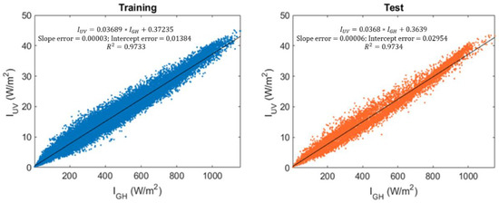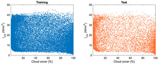 Figure 5 also shows the relationship between solar height and ultraviolet radiation for both the training and test datasets. These figures are included because solar height will be a variable that will be part of the selected models, as can be seen in Table 3, while Figure 6 represents the ultraviolet radiation vs. cloud cover for both datasets.