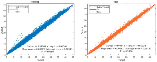 Figure 7 shows the values predicted with ANN model number 9, where the “Output” corresponds to the neural network outputs and “Target” to the experimental values for both training and test dataset results.