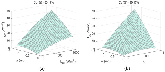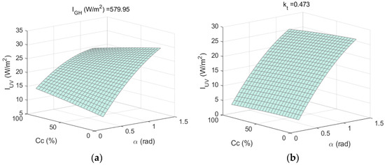 Figure 8, Figure 9 and Figure 10 show the response surfaces obtained with the second-order regression models shown in Equations (13) and (17), which correspond to the second-order regression models developed for , α, and cloud cover and for , α, and cloud cover, respectively.