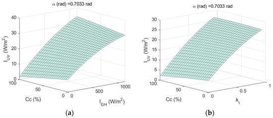 Several works have developed different mathematical models for obtaining UV values as a function of certain atmospheric parameters such as relative optical air mass, cloud modification factors [3,21,22], aerosols, different tilt angles and ozone as well as local surface characteristics (albedo) [23], cosine of the solar zenith angle [2], precipitable water content, total ozone column, aerosol optical depth, temperature, humidity and dew point temperature under all sky conditions [13]. Many other works observed that and are mainly affected by solar zenith angle [24]. Besides the variation in solar zenith angle, cloud cover is an important factor in UV levels [25]; however, under clear skies, the most important factor in the attenuation of solar radiation are aerosols [26]. The model is therefore often programmed to perform a preliminary classification of the atmospheric conditions, based on sky types, using the clearness index as a classifier with different time intervals [2,3,27]. The UV component has been modeled in China, using two input parameters: the effect of the comprehensive attenuation factors for assumed cloud-free conditions and the effect of the clouds; this has obtained good results at a different location from the one at which model was developed [28]. Other models were used to estimate under various sky conditions, analyzing the dependence of UV irradiance on the brightness index, and the solar elevation angle [27]. It has been shown, using the brightness index as a parameter to model cloudiness, that clouds hardly reduce the UV component, but the horizontal global component does [3]. If a specific brightness is used, it is observed that the UV component increases almost exponentially with the zenith angle [29]. In addition, different statistical models have been developed to estimate daily from through the linear correlation; these introduce a polynomial correction of the average ratio as a function of the transmittance index of global solar irradiance and the UV atmospheric transmittance index by means of a multiple regression of the air mass and clearness index [11].