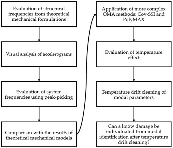In this section, the authors describe the methodology followed in the study. In the first step, the accelerometer data are observed, and a simple visual assessment is made to see if there is any macroscopic anomaly. If no anomaly is found visually, the accelerometer data are analyzed using the peak-picking method; the simplest and least computationally demanding OMA method.
