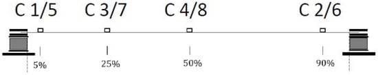 Figure 3 shows the position of the accelerometers on the rods; they are named with the letter C followed by a number, indicating the column of the matrix in which the data for that accelerometer are collected. For beam 1, the sensors are C1, C2, C3 and C4 and the accelerometer data are collected in column 1, 2, 3 and 4 of the acquisition matrix. For Beam 2, the sensors are C5, C6, C7 and C8 and the accelerometer data are collected in columns 5, 6, 7 and 8 of the acquisition matrix.