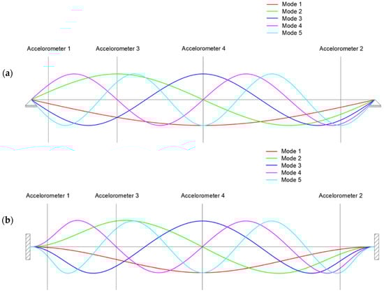 The natural frequencies obtained under the different hypotheses described in the previous paragraphs are presented in Table 2. The outputs of each mode refer to similar modal shapes. The modal shapes of the first 5 vibration modes are shown in Figure 4 for simply supported beam and fully restrained beam conditions.