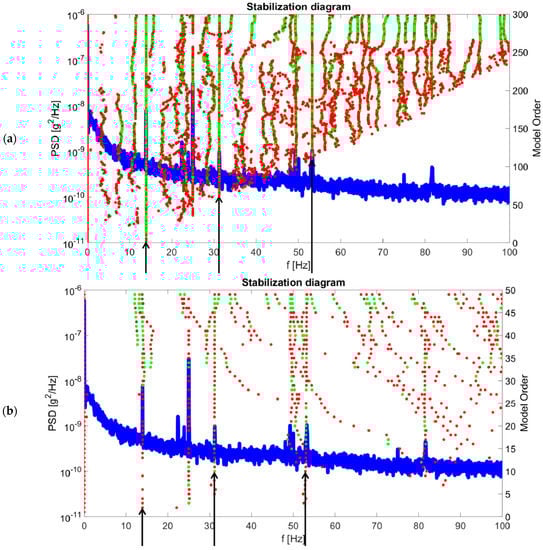 The system under evaluation should be observable and controllable []; for a system of order N, its observability and controllability matrices must have rank N. In practice, the order of the system is unknown, and its accurate determination is very complex due to the uncertainty and the noise that accompanies the sampling. For this reason, a conservative approach will overestimate the system order. This will cause the appearance of non-physical modes that must be separated from the physical modes by specific methods represented by the stabilization diagrams [,].