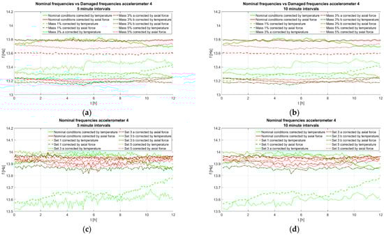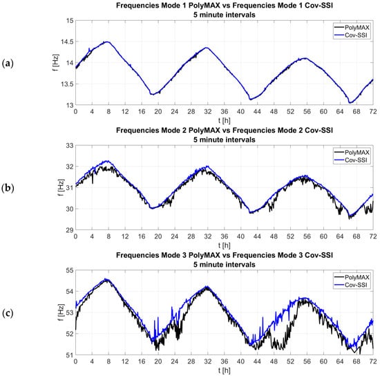 A comparison of the corrected frequencies over 12 h of the five analyzed datasets is shown in Figure 11 for the results obtained using peak-picking method for Mode 1. Completely similar results are obtained for higher modes with PolyMAX and Cov-SSI.